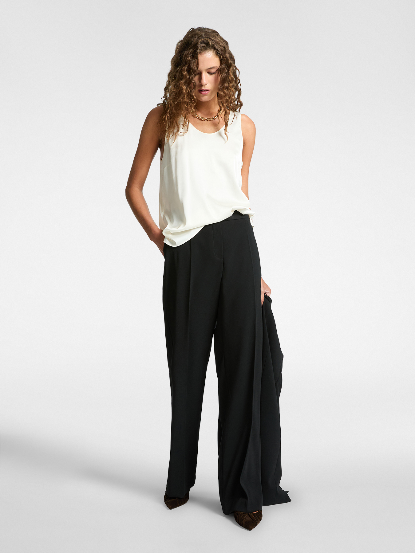 Топ из эластичного вискозного атласа. V-образный вырез, облегающий крой. Простое, базовое, но элегантное изделие, необходимое в гардеробе. Идеально сочетается с кардиганом, рубашкой или жакетом.