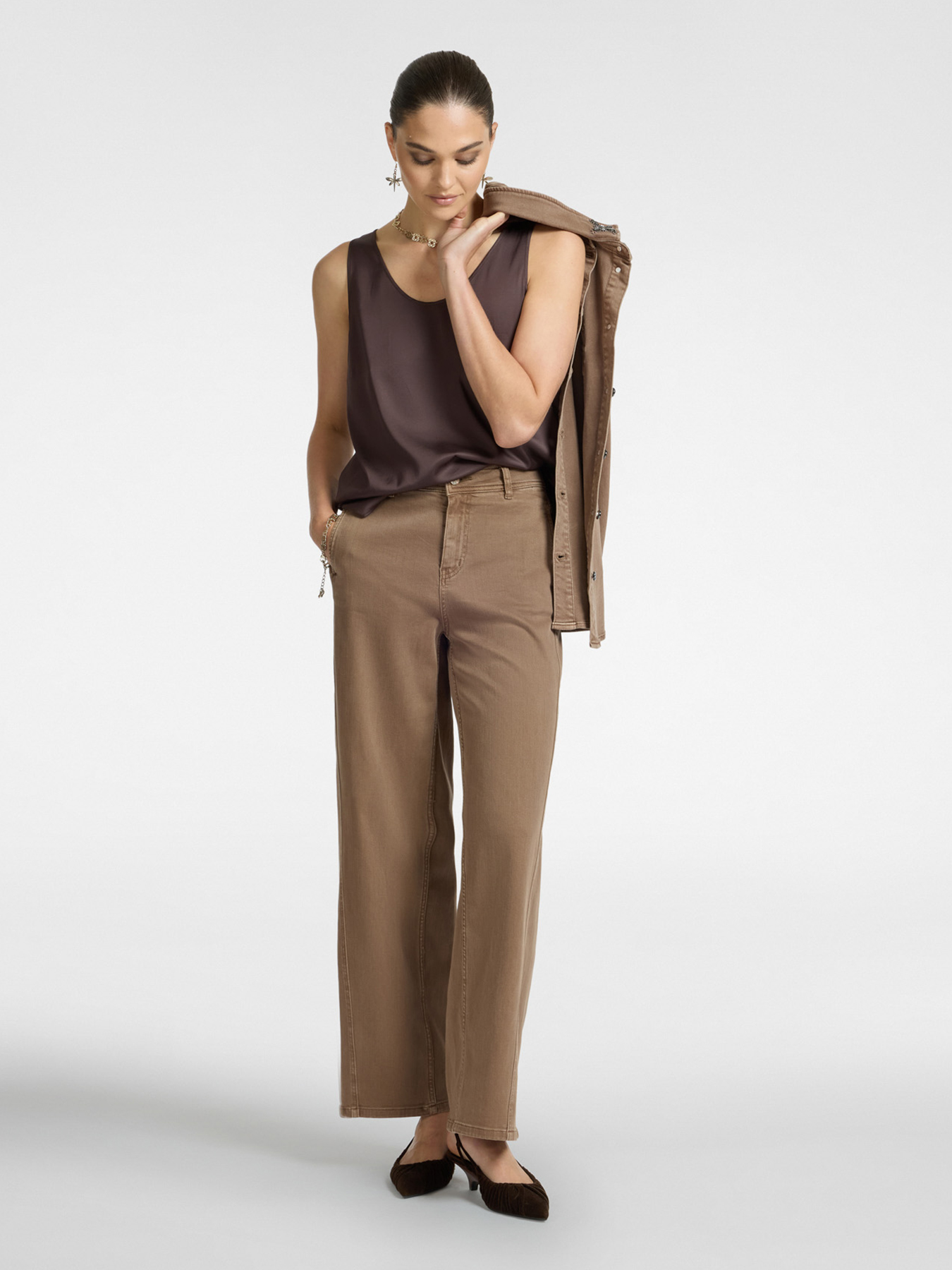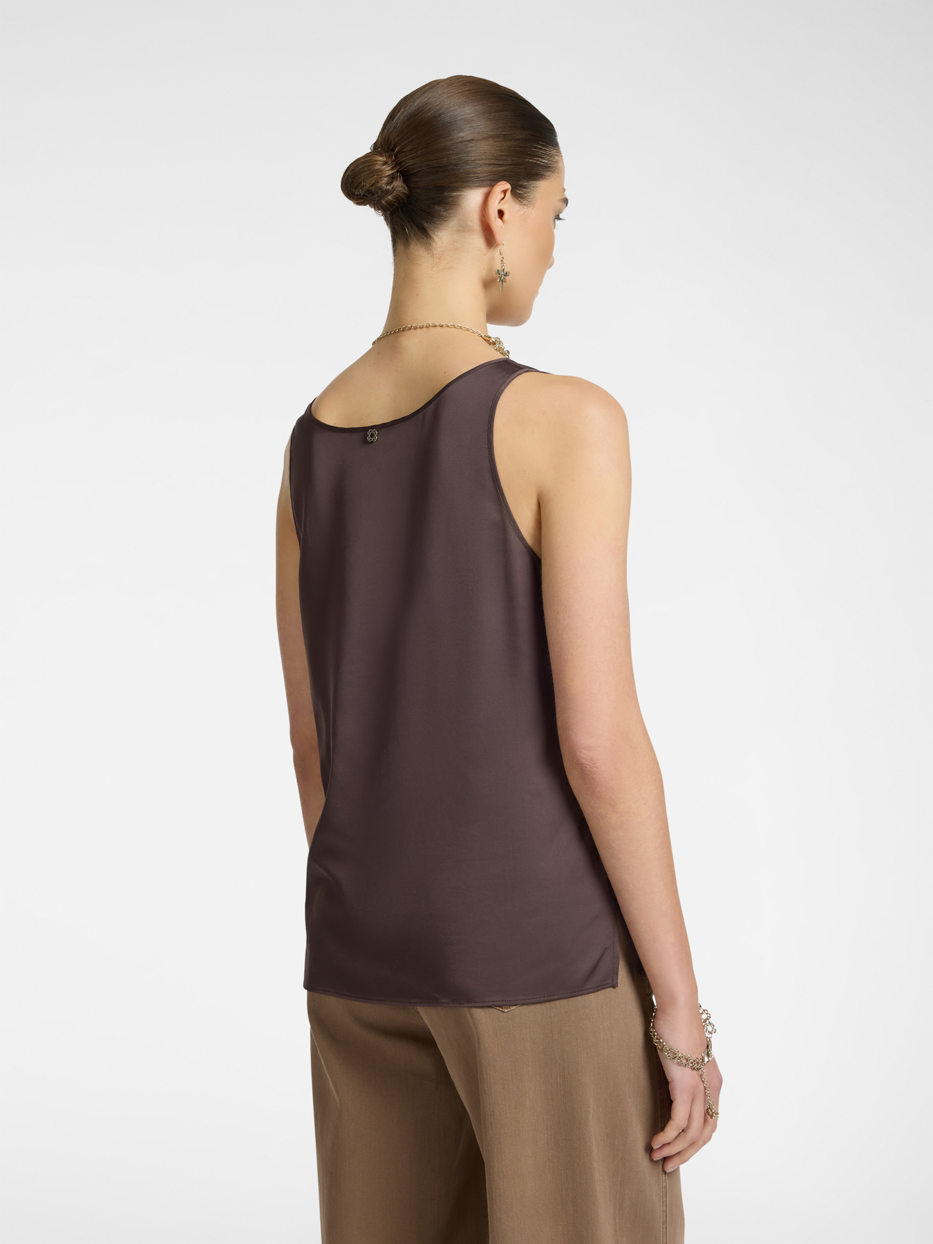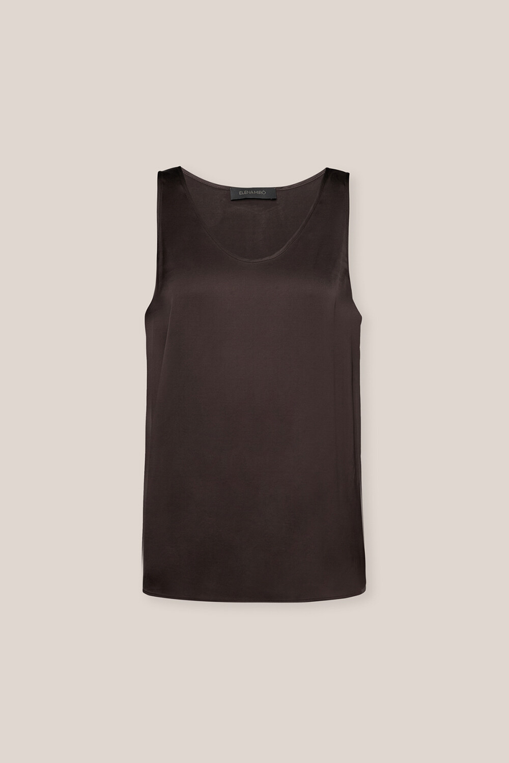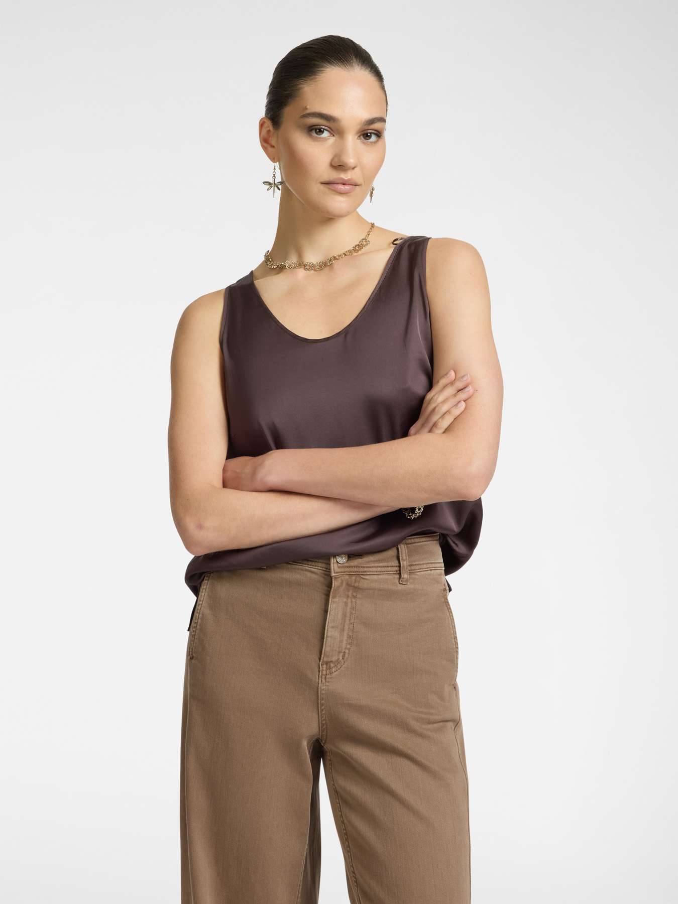 Топ из эластичного вискозного атласа. V-образный вырез, облегающий крой. Простое, базовое, но элегантное изделие, необходимое в гардеробе. Идеально сочетается с кардиганом, рубашкой или жакетом.
