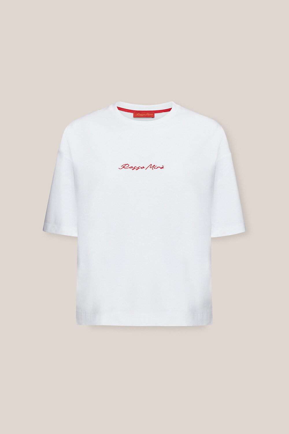 Футболка с коротким рукавом из 100% хлопка. Свободный крой, круглый вырез, яркий красный цвет. Изделие укрощено аппликацией из страз в форме монограммы бренда. Идеальное дополнение как для повседневных, так и для формальных случаев.