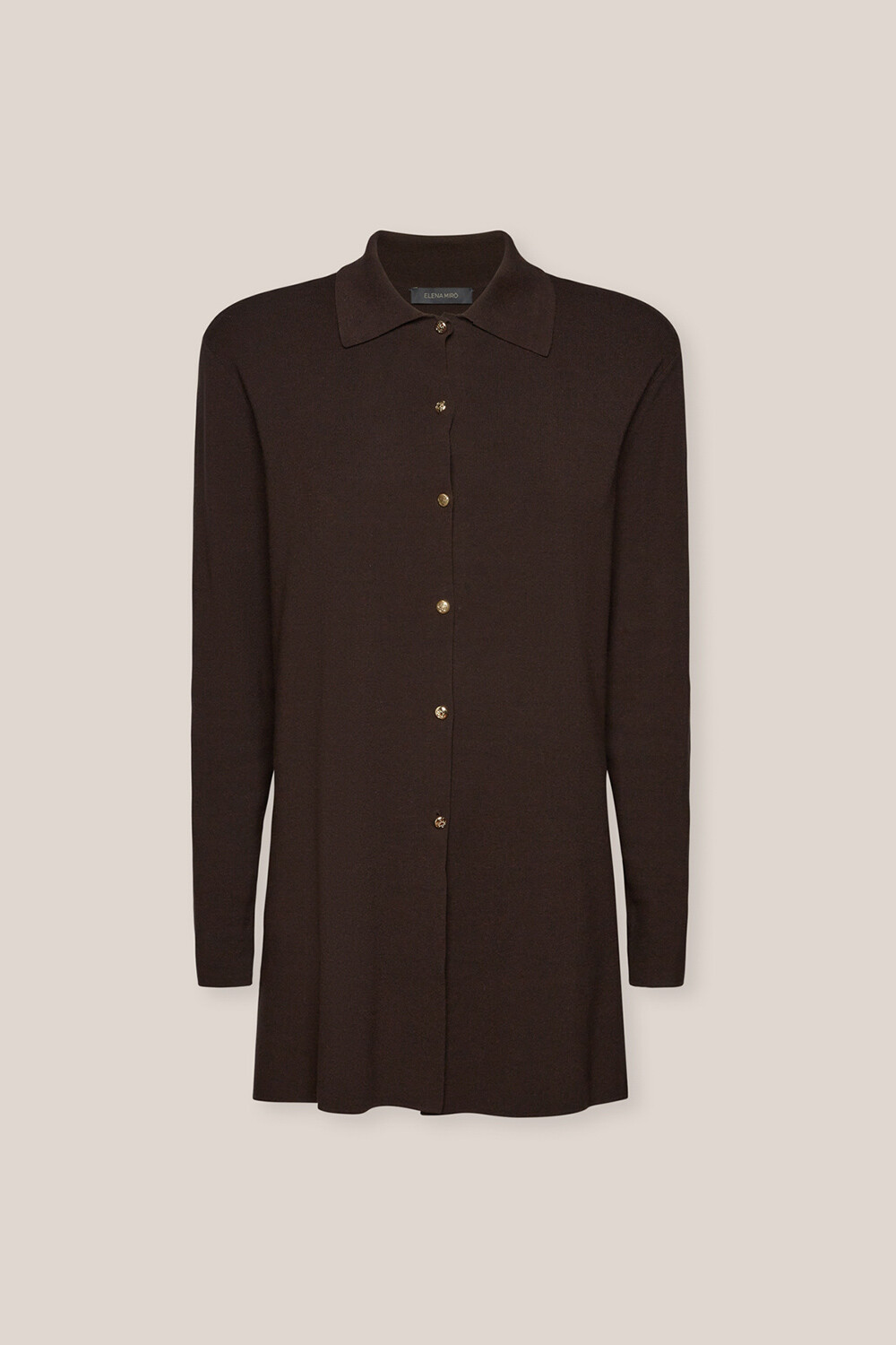 Длинный кардиган на пуговицах и воротником из вискозы эко веро. Маленькие металлические пуговицы с монограммой — эффектная деталь. Предлагаем сочетать с трикотажными брюками для создания удобного и изысканного образа.
