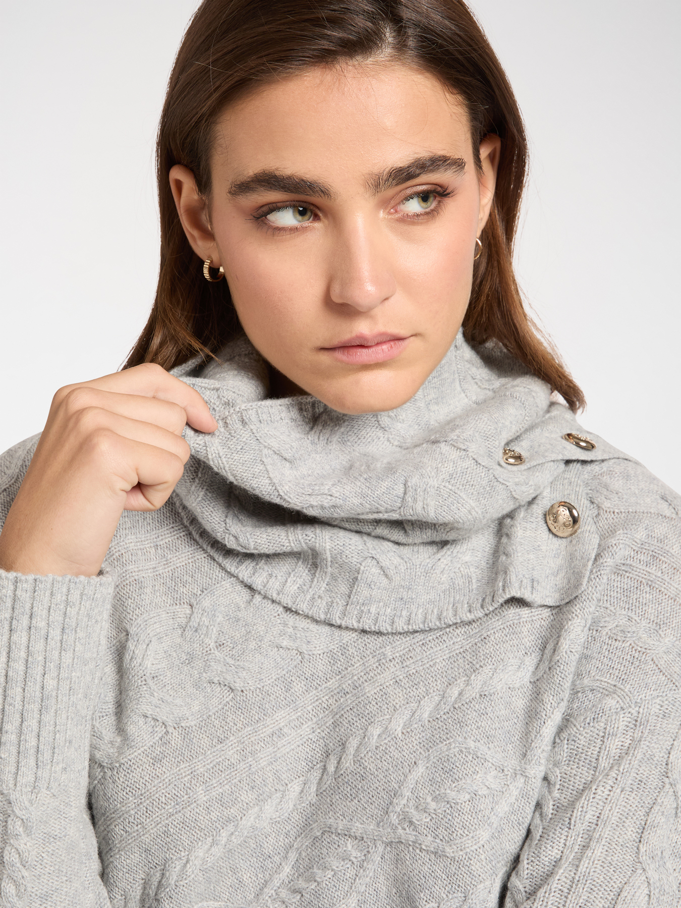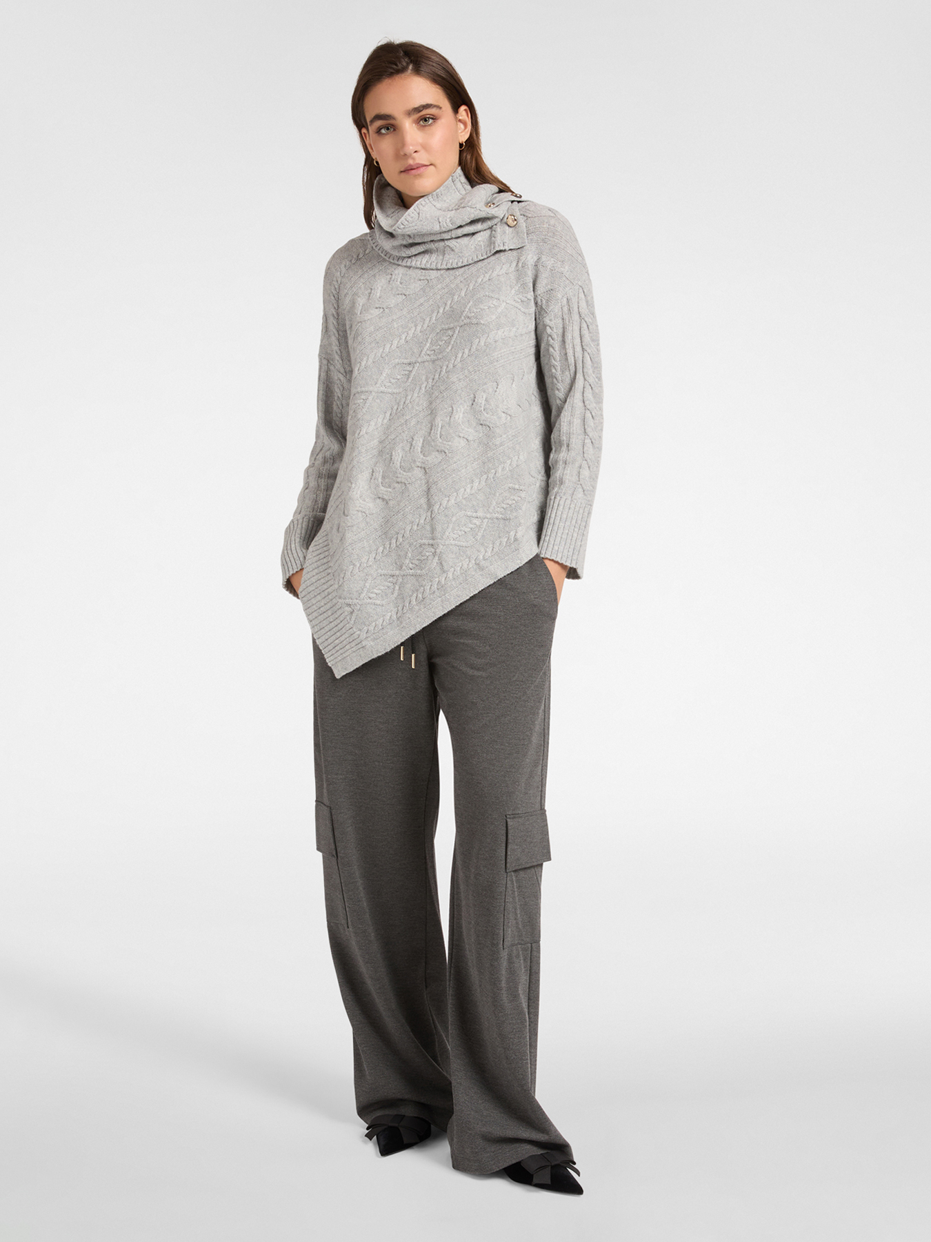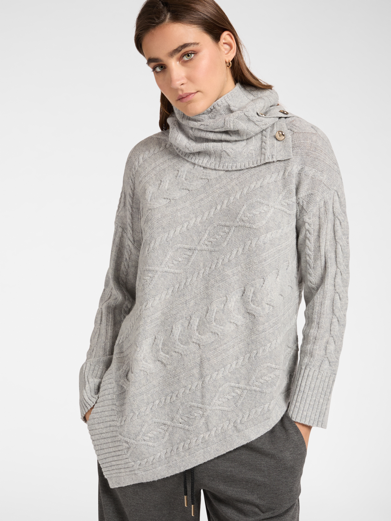 Асимметричный свитер из мягкой 100% шерсти с широким мягким воротником и небольшими пуговицами с монограммой бренда. Переплетенные стежки и диагонально расположенная вязка в виде кос. Теплое и удобное изделие, напоминающее ирландские свитер «ARAN». Идеально подходит для холодного зимнего сезона