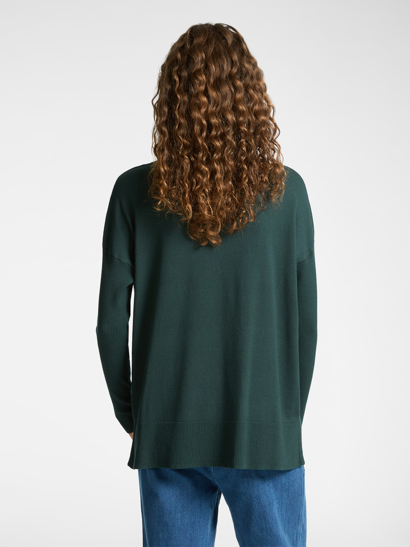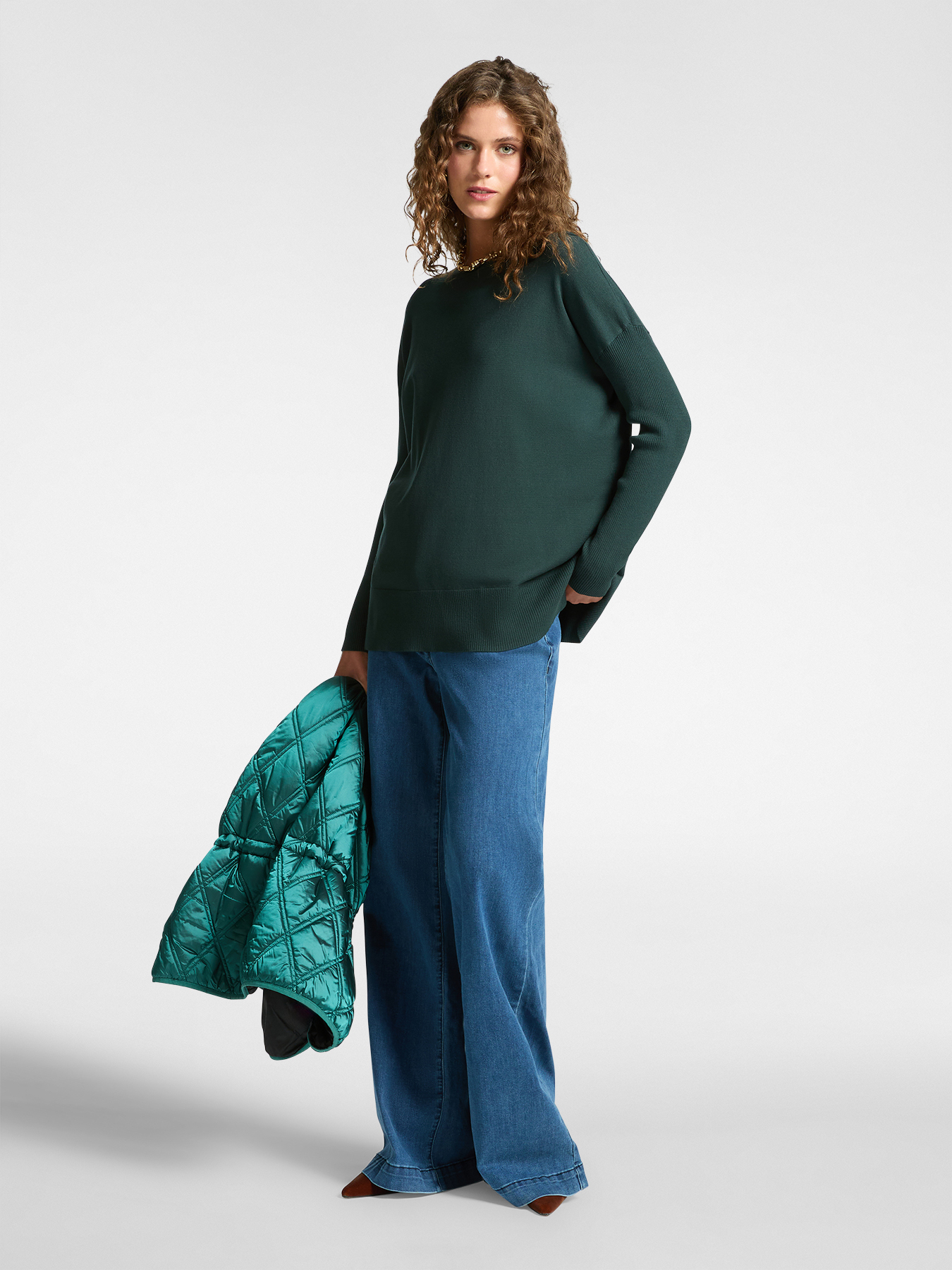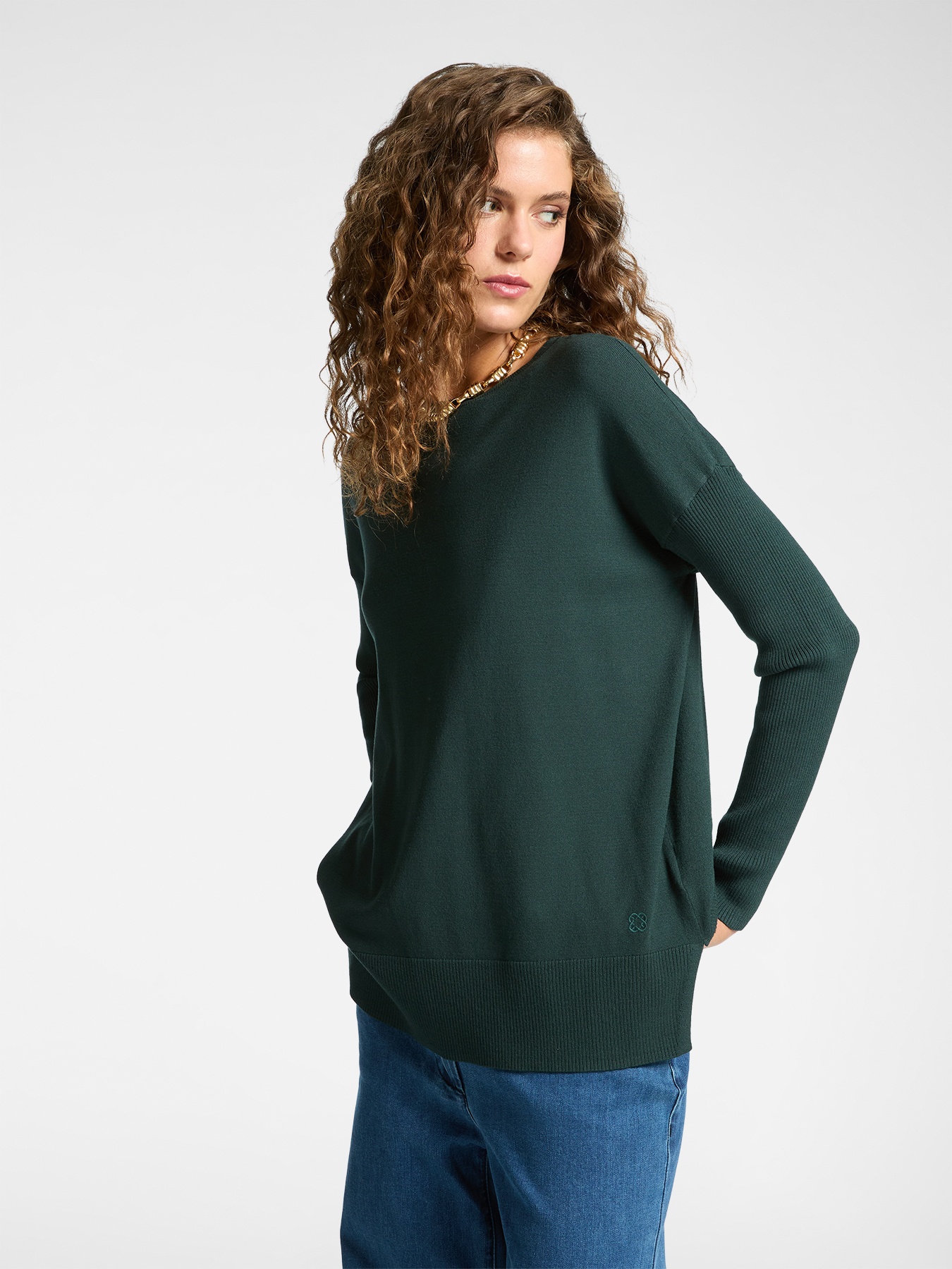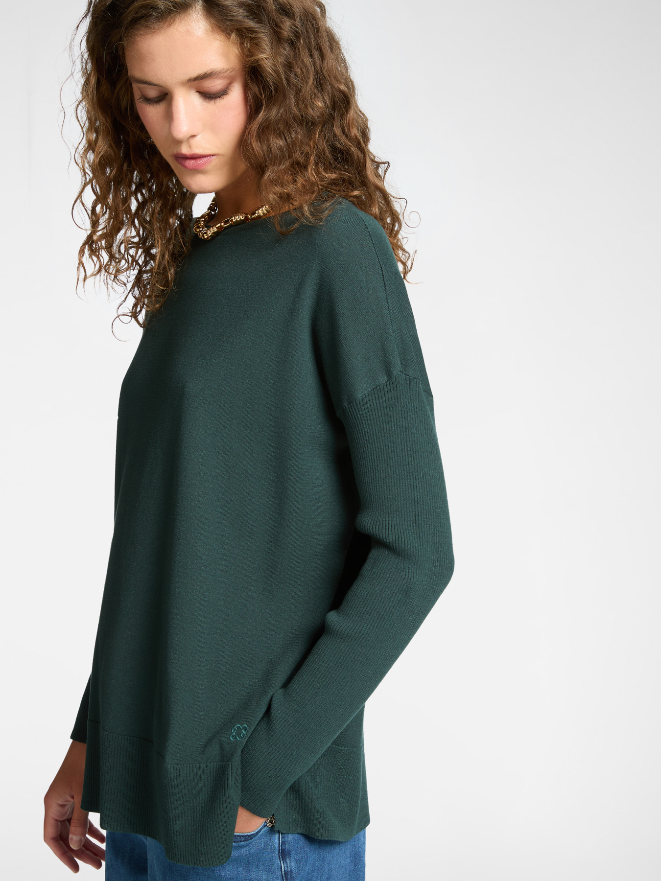 Джемпер с вырезом лодочкой, прямого кроя из приятной вискозной пряжи. Небольшая монограмма, вышитая на изделии, добавляет изделию изысканности и эксклюзивности. Базовый крой, спущенная линия плеч, узкие рукава и небольшие разрезы на подоле.