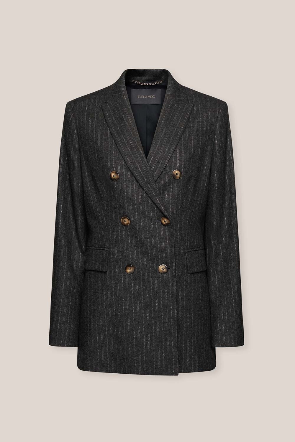 Двубортный жакет прямого кроя с заостренными лацканами и широкими плечами. Изготовлен из благородной фланели с изящной тонкой полоской из люрекса. Идеально подходит для повседневного или формального образов.