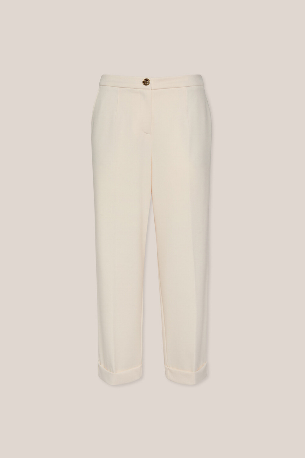 Брюки-чиносы из эластичного габардина. Прямой свободный крой, отвороты и заутюженная стрелка. Универсальная модель, подходящая для разных случаев. Прекрасно сочетается с жакетом в комплекте.