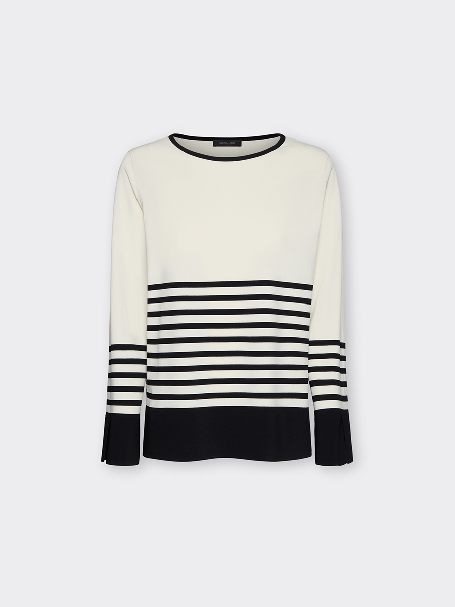 Джемпер из плотной и очень комфортной вискозной пряжи. Вырез «лодочка», длинный втачной рукав, свободный крой. Принт в полоску создает интересный контраст с основным цветом. Джемпер прекрасно дополнит любой образ.