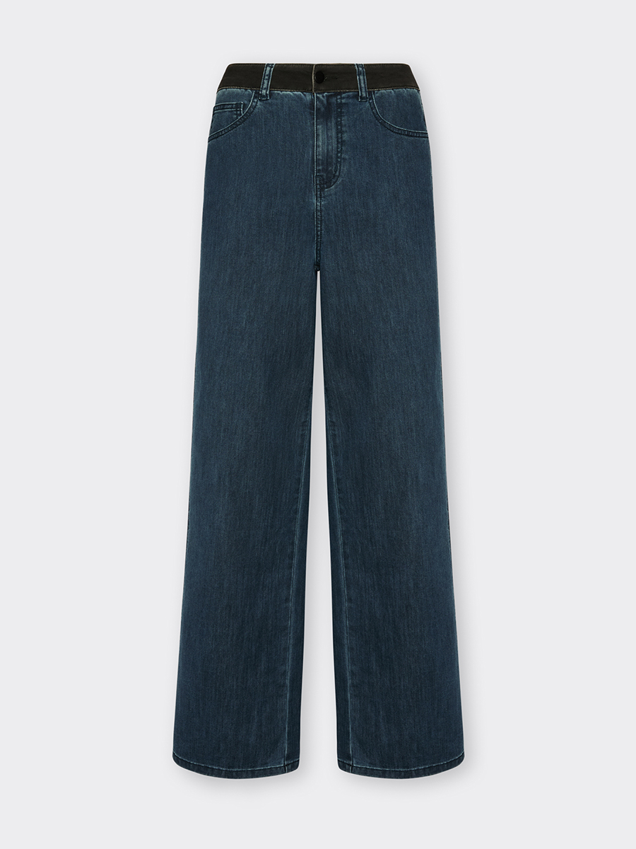 Джинсы свободного кроя Ванда. В боковой шов вставлена полоса из черного денима, добавляющая динамичный контраст и повторяющая цвет пояса. Небольшая вышивка в виде монограммы в тон на заднем кармане. Идеальный повседневный вариант.