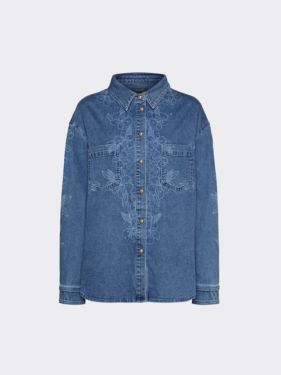 Джинсовая рубашка с уникальным узором, выполненным лазерной обработкой, напоминающим цветочные орнаменты. Цвет индиго, накладные карманы, спущенная линия плеч. Идеальный вариант для тех, кто ищем совмещение элегантности, комфорта и современности. Прекрасно сочетается с джинсами в комплекте.