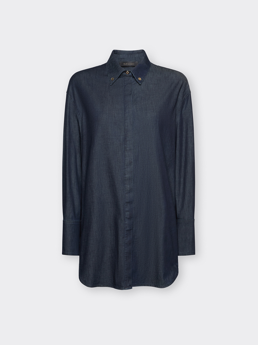 Рубашка из легкого шамбре. Мягкая на ощупь, прекрасно подходит для летнего сезона. Классический крой, закругленный подол, потайная планка. Особенности кроя обеспечат комфортную посадку даже на широкий бюст. Интересная деталь – две заклепки с монограммой на воротнике. Прекрасно сочетается с джинсами в комплекте.
