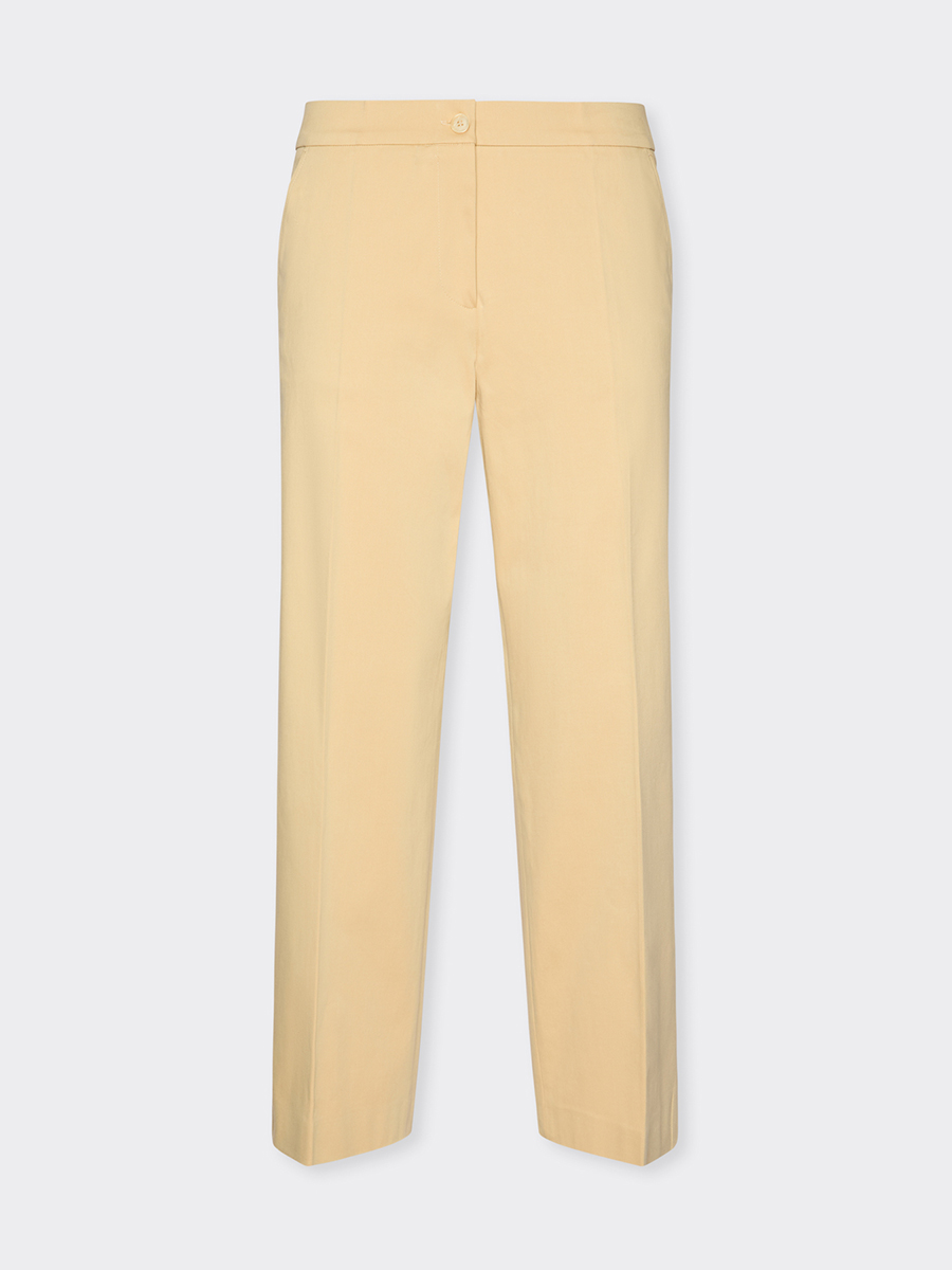 Прямые укороченные брюки из эластичного габардина, сочетающего преимущества хлопка и лиоцелла. Скошенный передний карман, перламутровая пуговица. Брюки прекрасно сочетаются с рубашкой в комплекте, создавая современный комфортный образ.