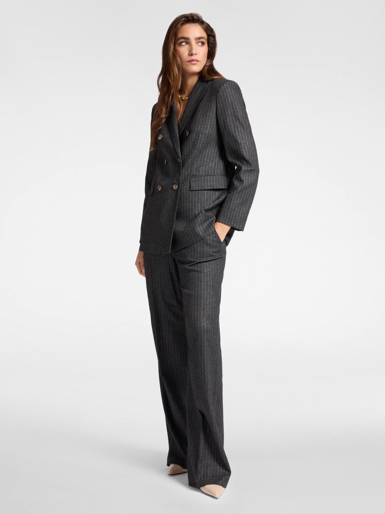 Брюки прямого кроя из благородной фланели с изящной тонкой полоской из люрекса. Прекрасно сочетаются с жакетом в комплекте