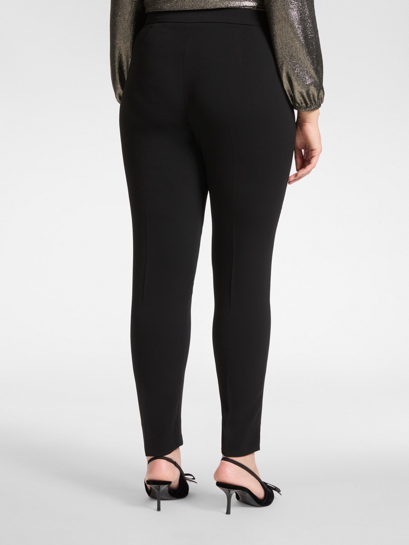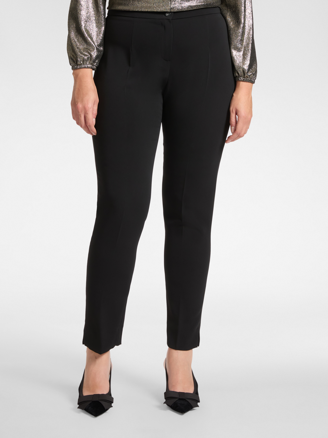 Брюки облегающего кроя из эластичного кади. Простая модель, которая украсит ваши повседневные образы. Стандартная талия, застежка на пуговицу и молнию, разрез и заутюженная стрелка. Повседневный комфорт и современная элегантность.